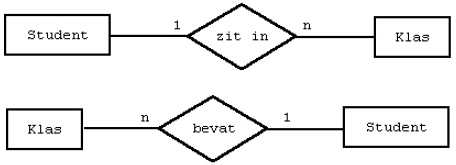 Een student zit in één klas. In een klas zitten meer studenten. Hier is sprake van een één-op-veel relatie tussen klas en student. Als je ‘klas’ en ‘student’ verwisselt, zeggen we: ‘Er is een veel-op-één relatie tussen student en klas.’ Met andere woorden: ‘Er zitten veel studenten in één klas.’ In de volgende figuur zie je hoe deze situatie grafisch wordt weergegeven.