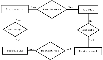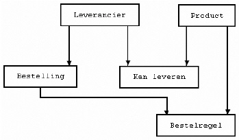 Product (productcode, productomschrijving, inkoopprijs, verkoopprijs, voorraad) Kan_leveren ( <leveranciercode>, <productcode>)Bestelling (bestelnummer, besteldatum, contactpersoon, <leveranciercode>)Bestelregel ( <bestelnummer>, <productcode>, besteld_aantal) |
